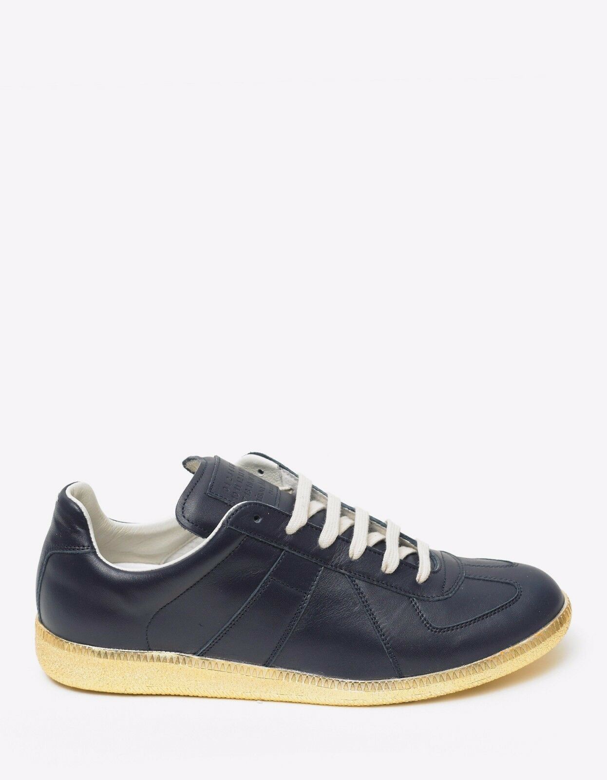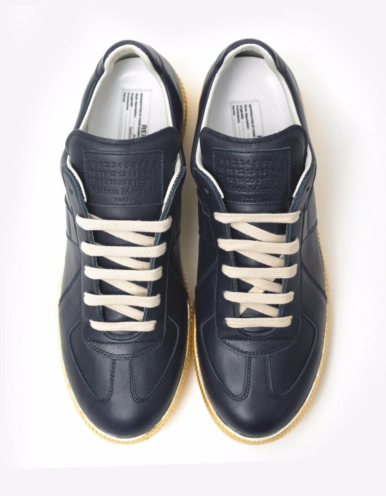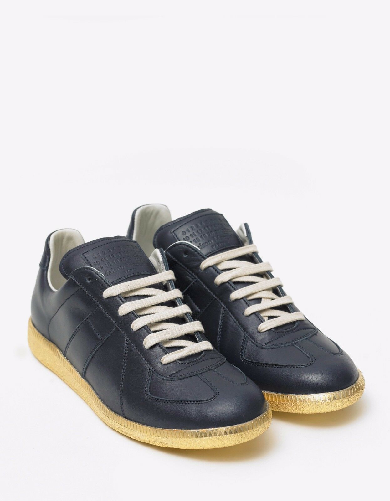 - Made from a navy blue calf leather and feature a contrasting gold rubber sole.